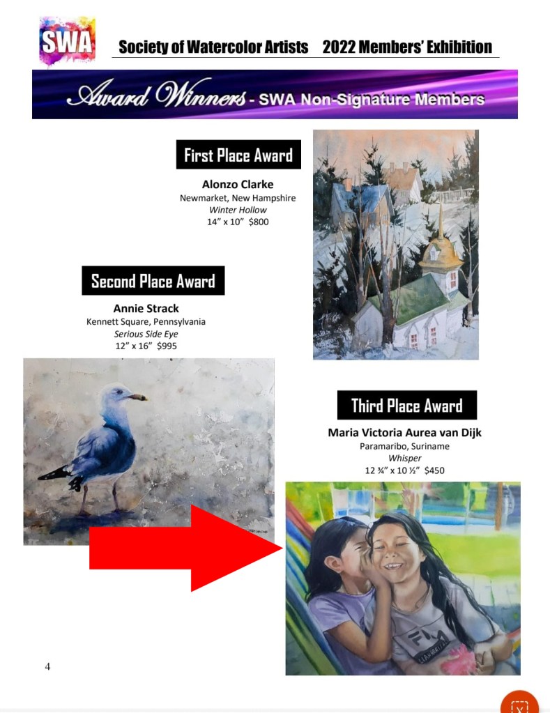 In spite of all the hassle, this entry went through with its shipment for I got to know that the glass of the frame of my painting broke during shipment. I am glad that SWA replaced the frame so I could enter the show. Then last Sunday, November 20 I got an email that my Watercolor painting “Whispering” bagged the 3rd place award in the Non-signature member category of SWA. I am so happy and overwhelmed knowing this wonderful news.